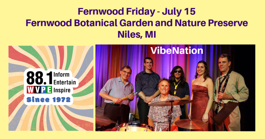 Due to anticipated rain we’ll be moving the event inside, and we can only accommodate the first 150 attendees. Anyone else is welcome to come walk around Fernwood, but bring an umbrella. "Fernwood Friday" is TONIGHT from 5:30-9 pm at Fernwood Botanical Garden on Range Line Road in Niles, Michigan. There will be live music with VibeNation plus food and drink available for purchase on-site.