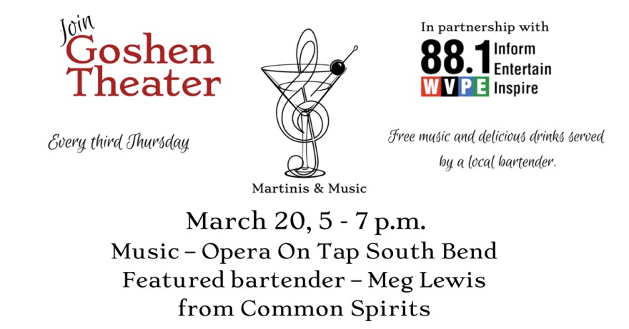 WVPE is a media sponsor for Martinis and Music at Goshen Theater. Our next third Thursday event takes place Thursday, March 20th in the Theater lobby from 5 to 7. Music will be performed by Opera On Tap South Bend that brings opera and classical music to new audiences by performing it in alternative venues. The featured bartender is Meg Lewis from Common Spirits. Martinis and Music is open to all aged 21 and above. More information is HERE or at GoshenTheater.org