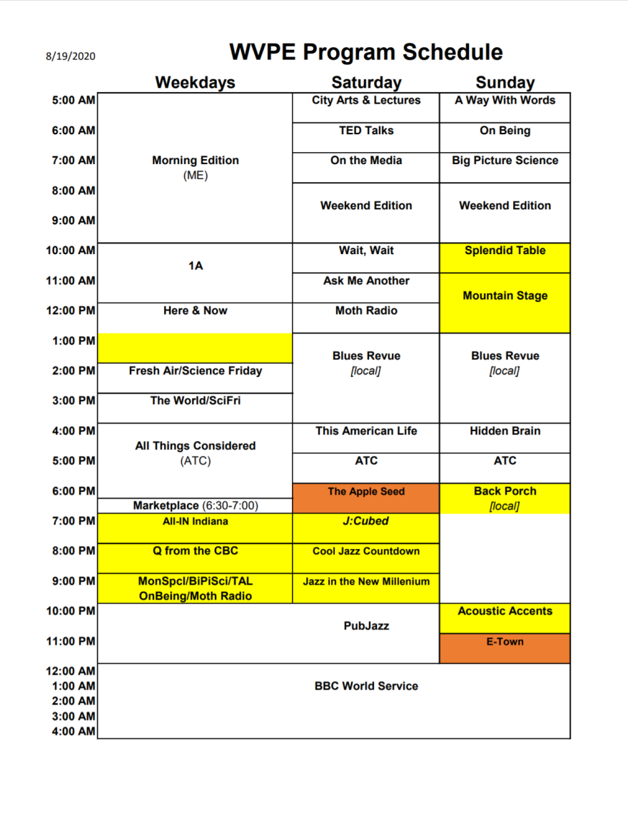 A new program lineup on 88.1 WVPE and on WVPE NEWS2 went into effect September 5th.