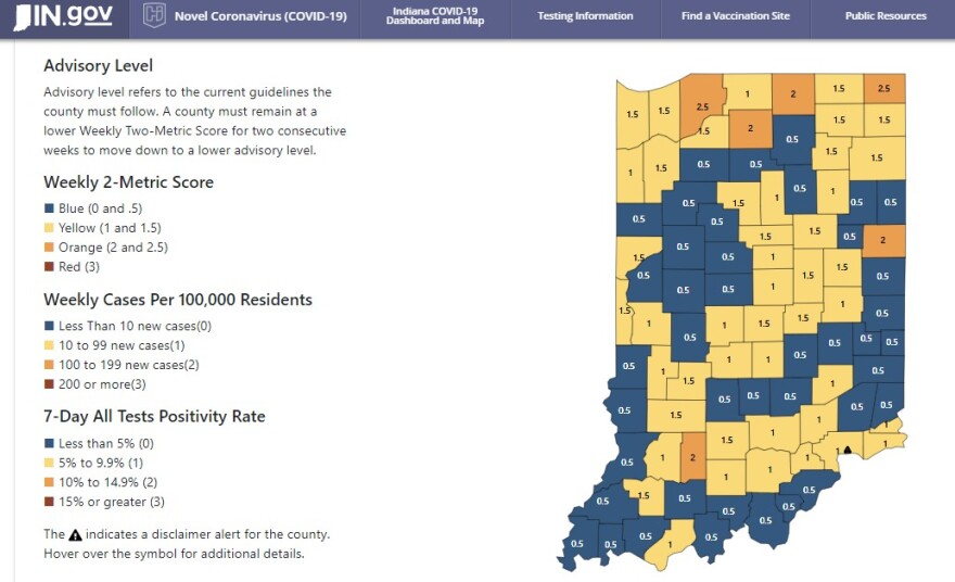 Three listener counties are now in the least-serious blue category, which indicates low spread of the virus. Fulton County maintained its blue status from last week, while Kosciusko and Pulaski counties moved to the blue from the more serious “yellow” category.