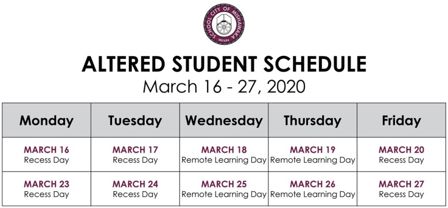 The safety of our students, staff, and families remains a top priority. Public health officials expect the virus to continue spreading and closing schools is an important way to slow down the process. As a result, School City of Mishawaka is announcing the closure of all school buildings and the utilization of an altered student schedule beginning, Monday, March 16, 2020 through Friday, March 27, 2020. Students are not to report to school buildings on these days.