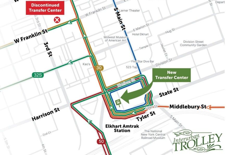 The Interurban Trolley is moving its Elkhart Transfer Center. Starting Monday, December 8, buses will stop on the east side of Second Street, between Tyler and Harrison, near the Amtrak station.